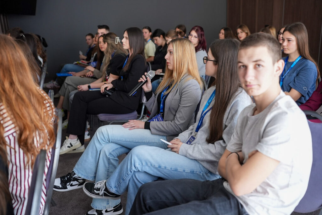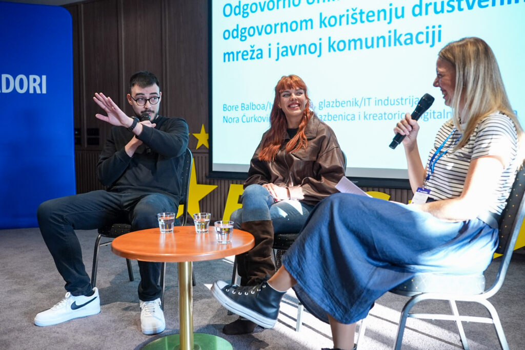 - Subota je donijela praktična znanja. Naša Rita sudjelovala je u radionicama za juniore, dok je profesorica Kokeza s kolegama seniorima planirala buduće aktivnosti. Posebno zanimljive bile su radionice o vještinama javnog nastupa te razgovor o odgovornom korištenju društvenih mreža s poznatim glazbenicima i kreativcima poput Bore Balboe i Nore Ćurković (naše bivše učenice).